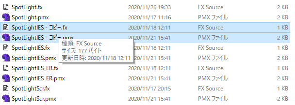 そしたら、適当に同じ名前で.pmxファイルと.fxのファイル名部分だけ変更します。この例ではYasuIES.pmxとYasuIES.fxとしました。