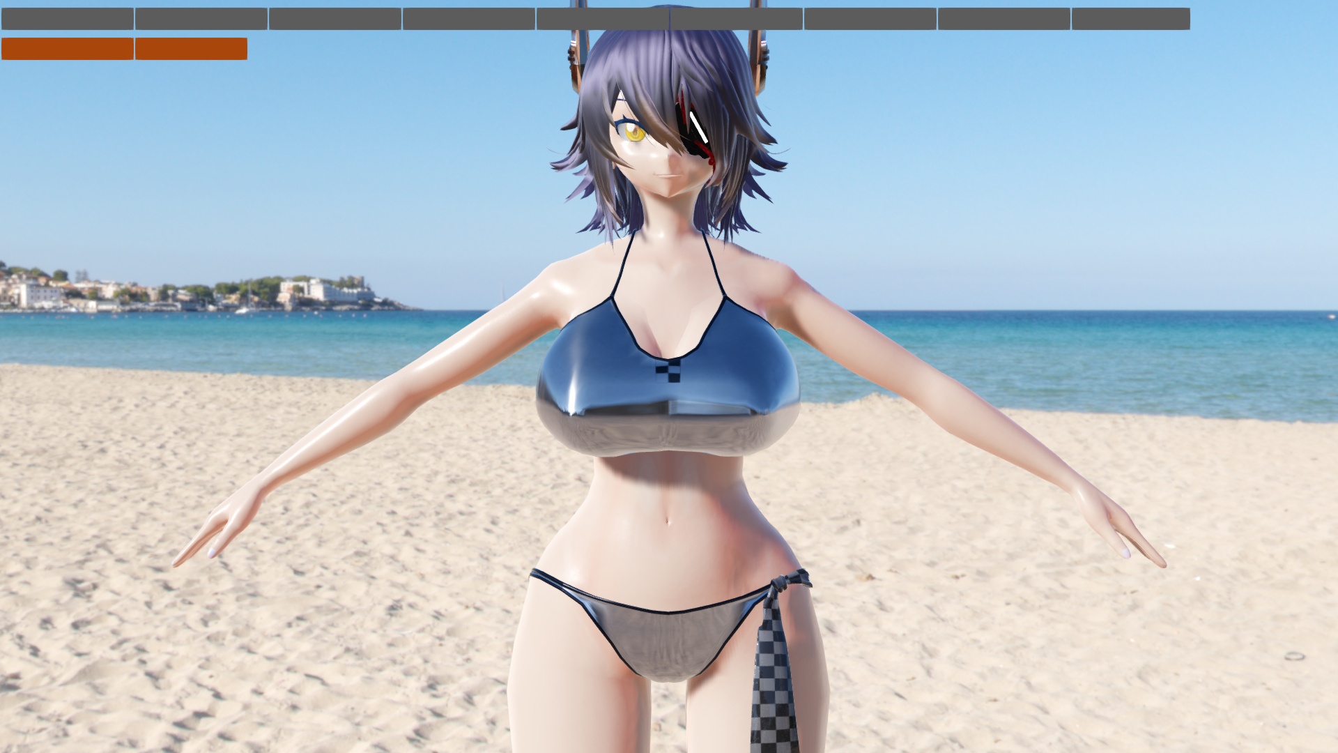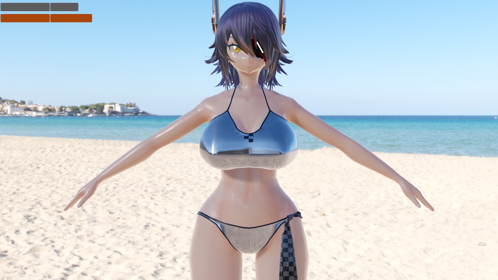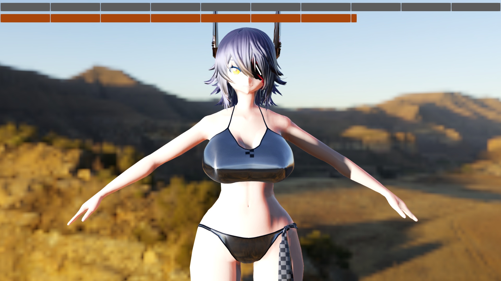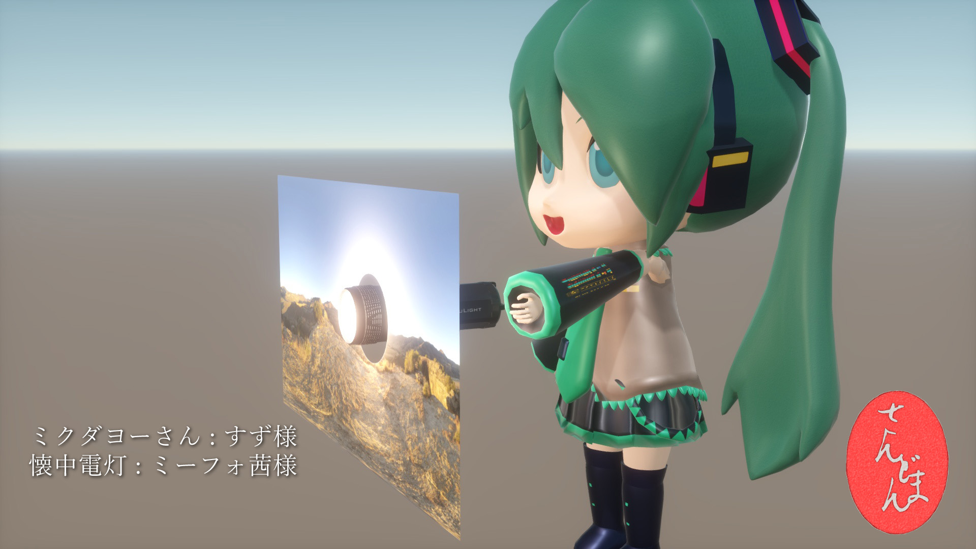 照度計を何に使うのかと言うと、環境光と直接光の明るさのバランスを取るために用います。先に挙げた画像では、晴天の海岸に天龍ちゃんが立っていますが、なんだかメリハリがありません。照度計を見ると平行光源の明るさより環境光の明るさの方が高くなっています。 基本的に、直接光に対する環境光の比率が増すほど絵は平坦な印象になり、曇った雰囲気になります。
