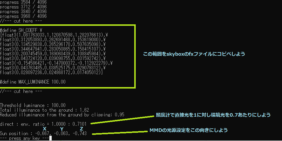 Version2.70より追加されたhdr2skyboxを使って作られたskyboxの.fxファイルには、この情報がそのまま出力されていますので、中を覗いてみてください