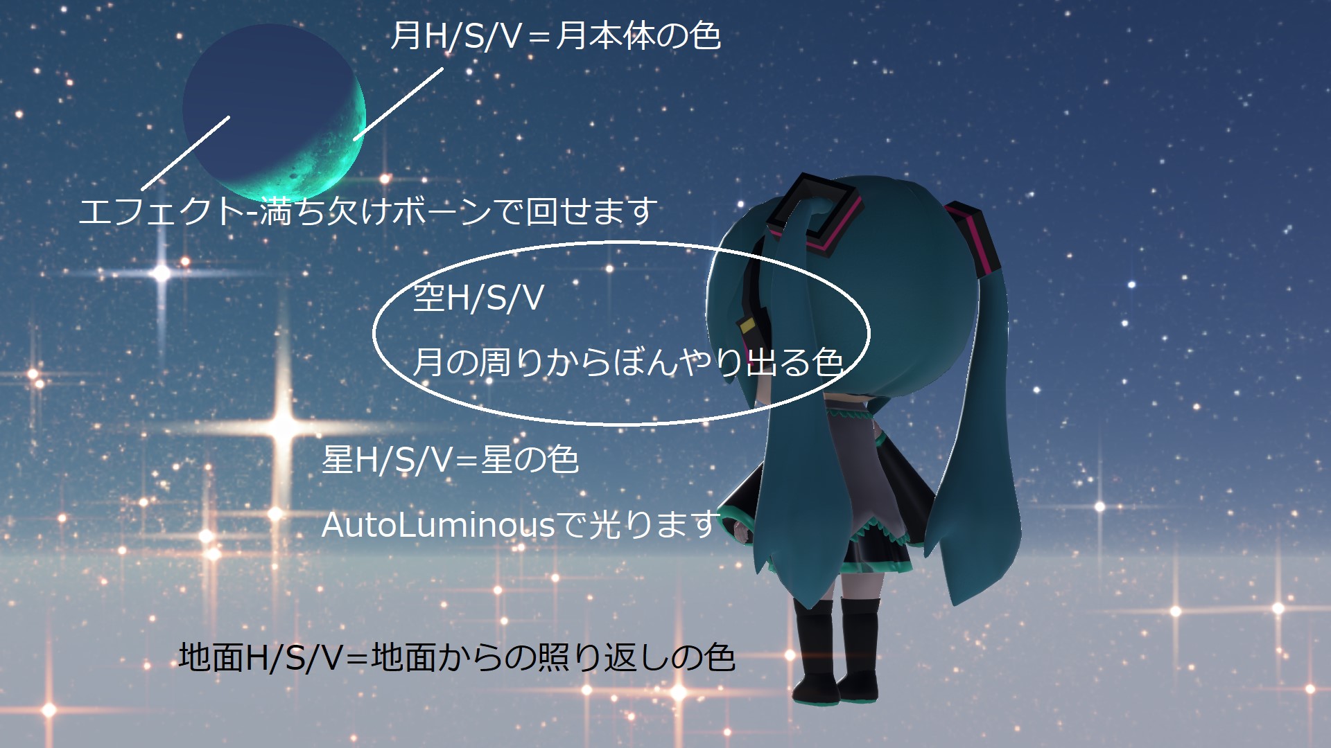 使えるようにするまでのステップはNightDynamicSkybox.x,NightDynamicSkyboxDisplay.pmxを使う点以外はDayDynamicSkyboxと全く一緒ですが、いじれるパラメータが夜用のほうがずっと多いことに気づくと思います。